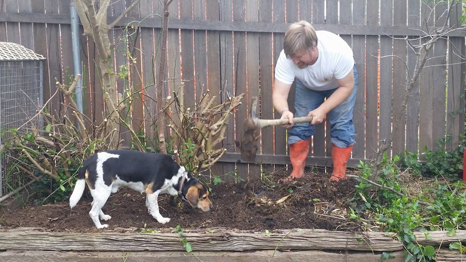 Zac the beagle is a great helper with digging out grubs when refurbishing soil.