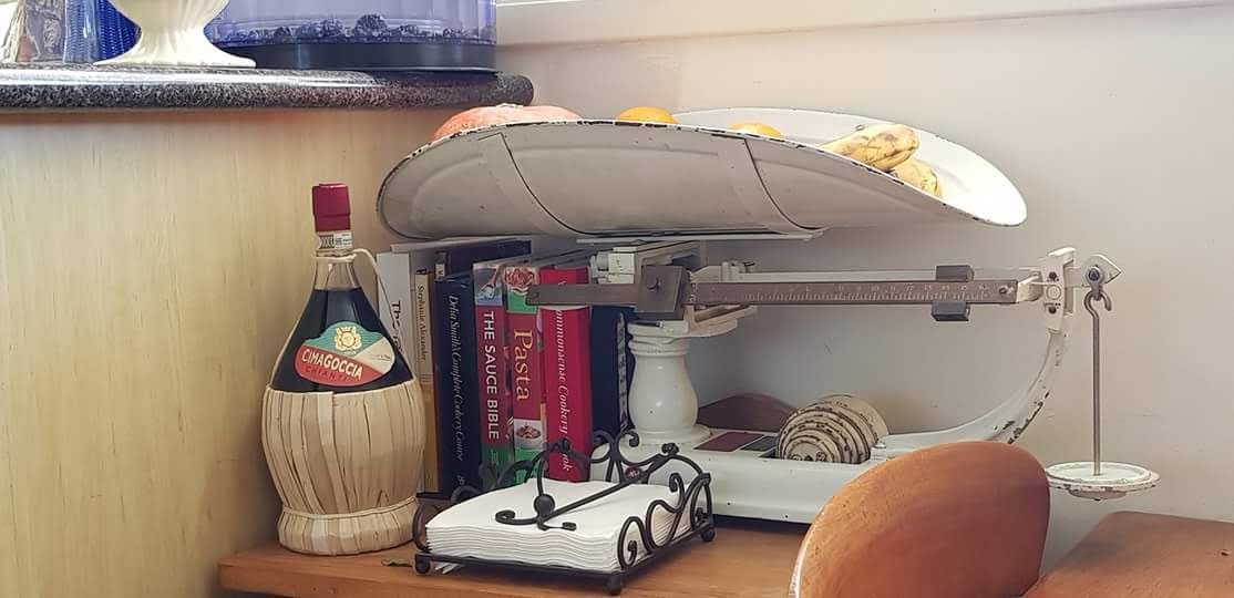 Vintage baby scales salvaged have been re purposed as fruit bowl.